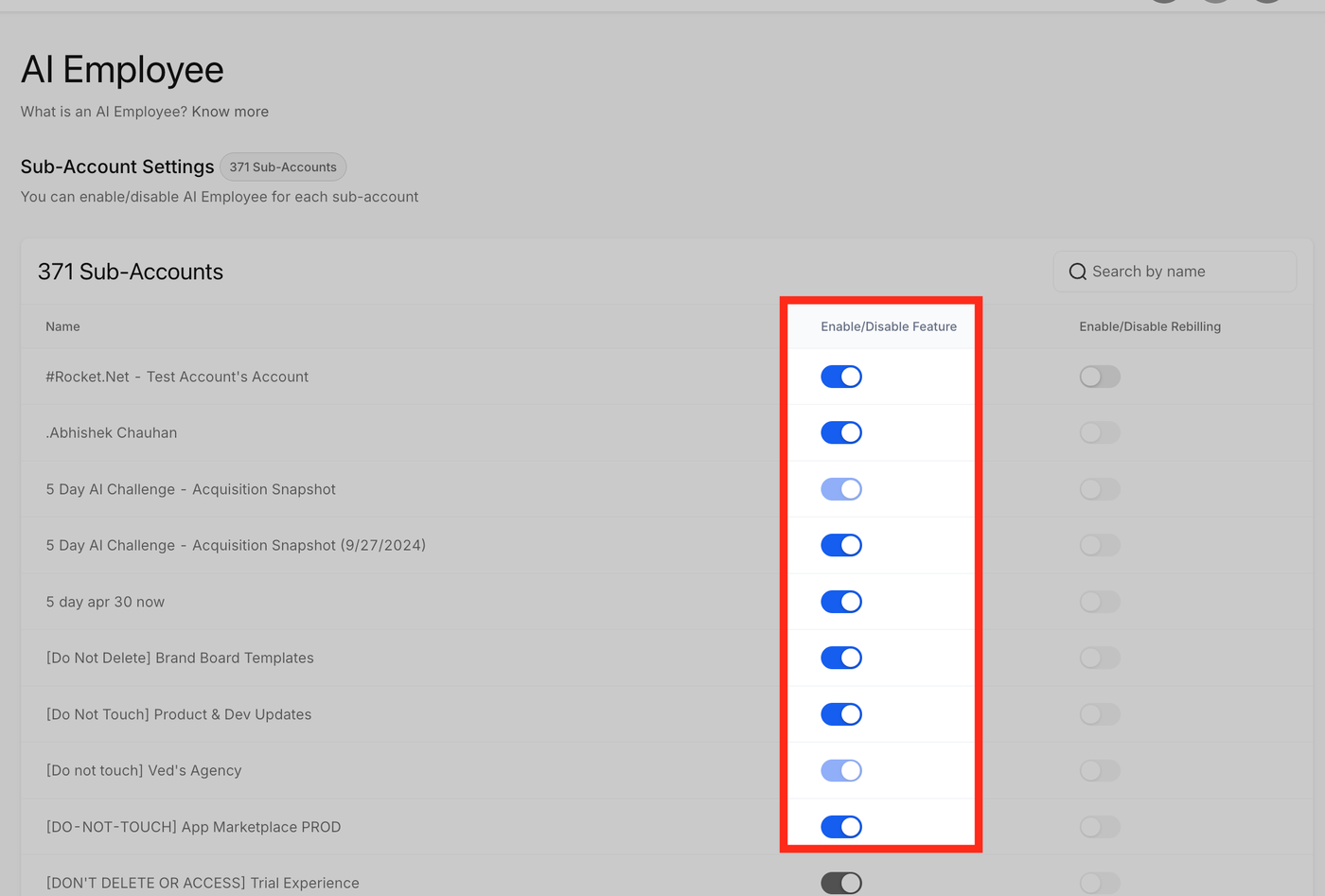 Hier siehst du in der ersten Spalte eine Liste deiner Sub-Accounts. Neben jedem Sub-Account befindet sich ein Toggle, mit dem du den „AI Employee“ für jeden einzelnen Sub-Account aktivieren oder deaktivieren kannst.