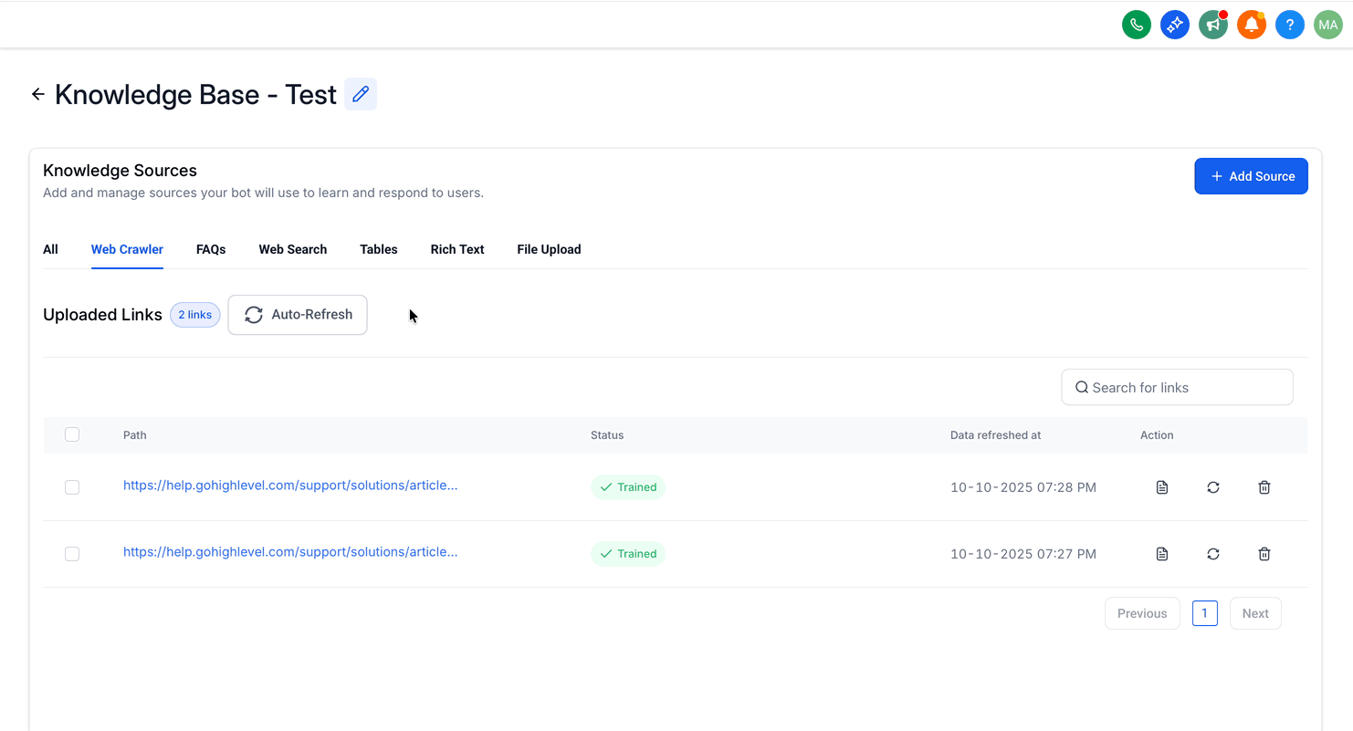 WICHTIG: Die automatische Aktualisierung von Knowledge Base Trained Links ist derzeit in Labs verfügbar. Wenn du sie nicht siehst, bitte einen Admin, sie unter Agentur-Einstellungen > Labs zu aktivieren. Weitere Informationen findest du unter Labs Features – Vollständige Übersicht.