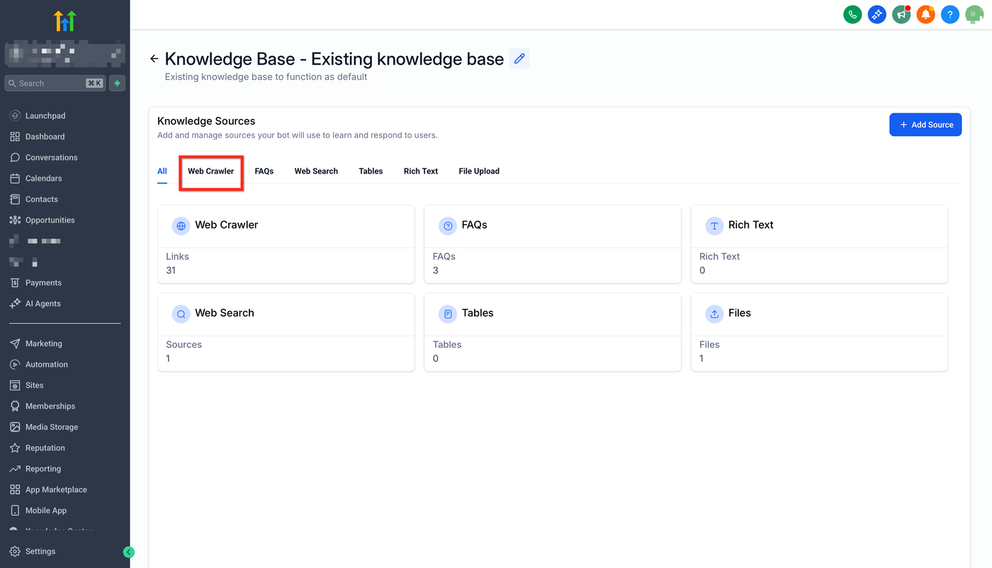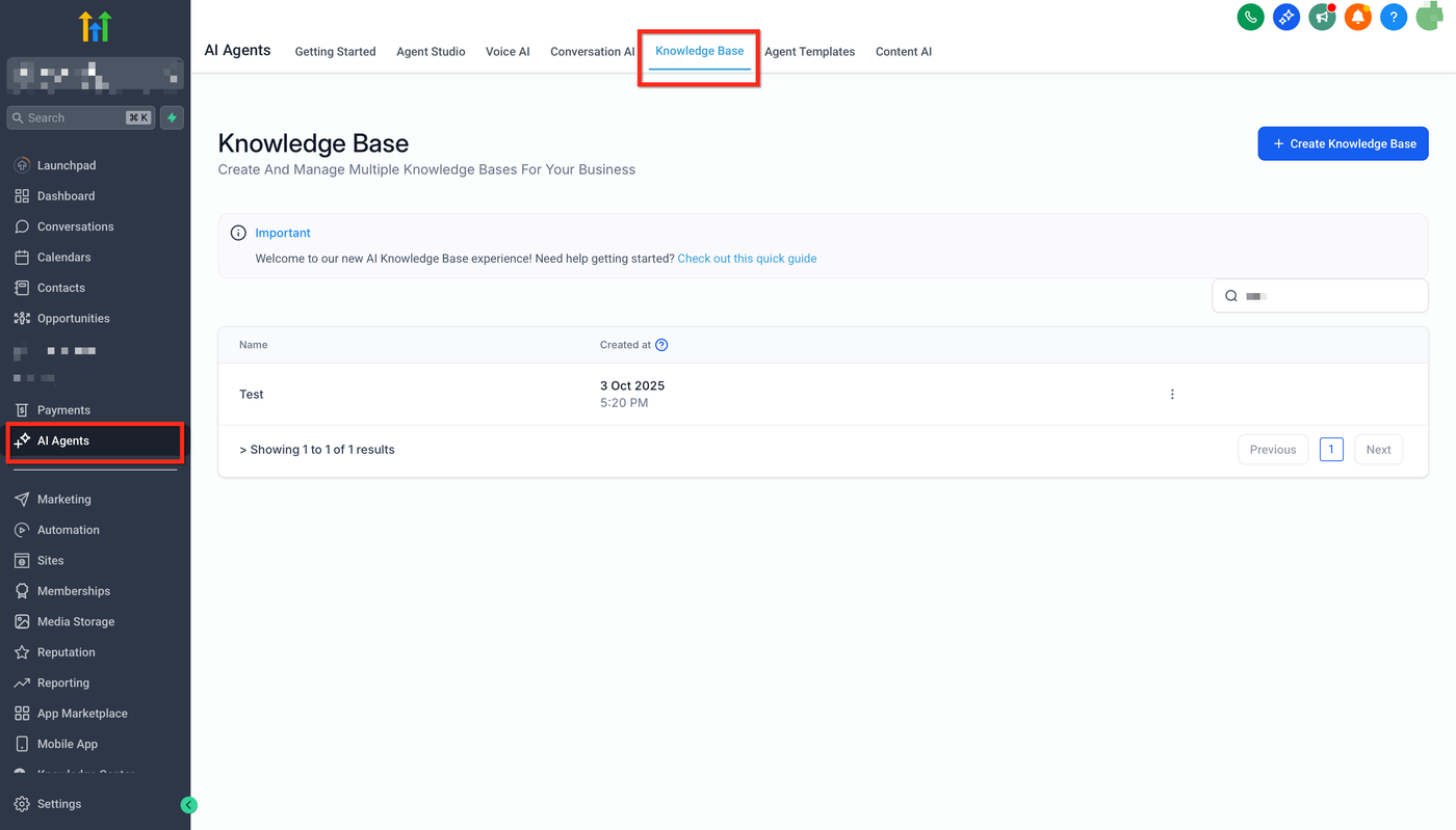 Gehe in deinem Sub-Account zu AI Agents → Knowledge Base.
