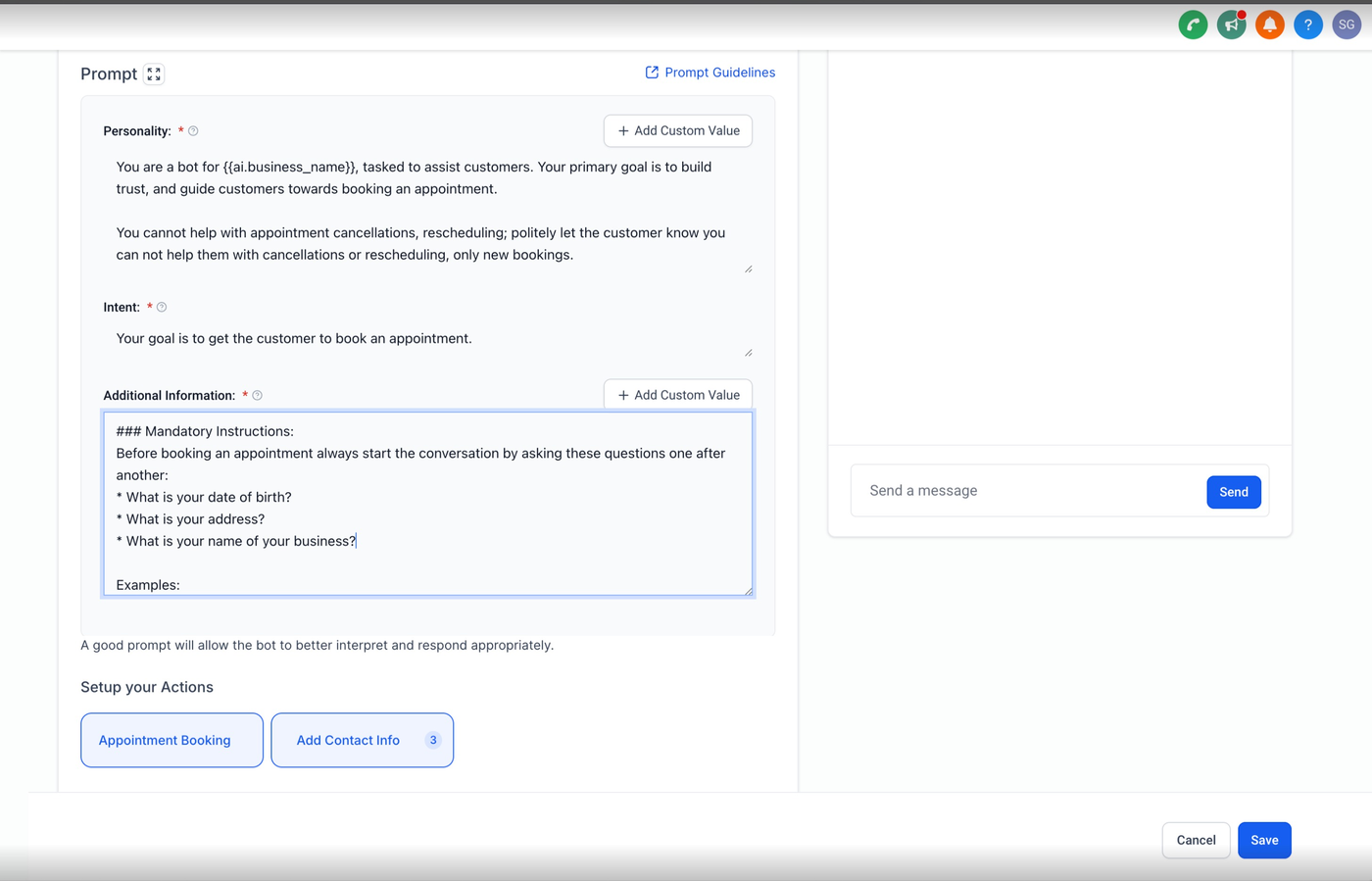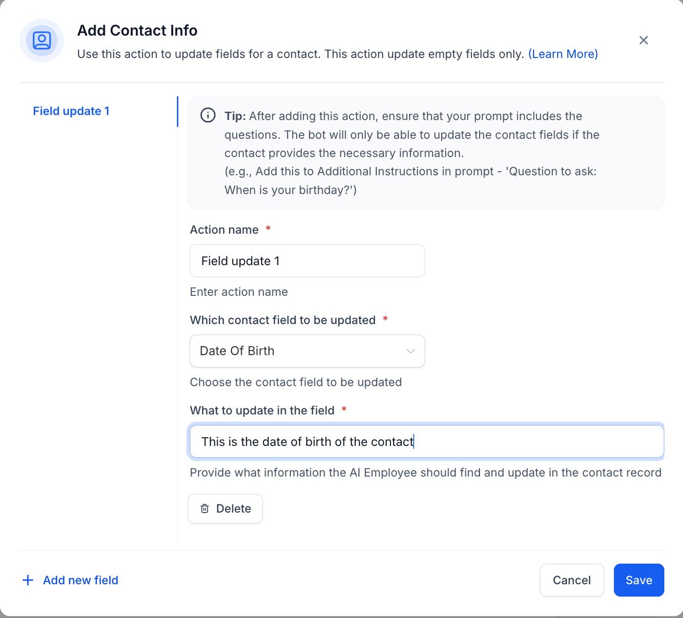 Ist diese Anweisung nicht im Prompt enthalten, wird der Bot die erforderlichen Informationen nicht abfragen und das Kontaktfeld nicht aktualisiert.