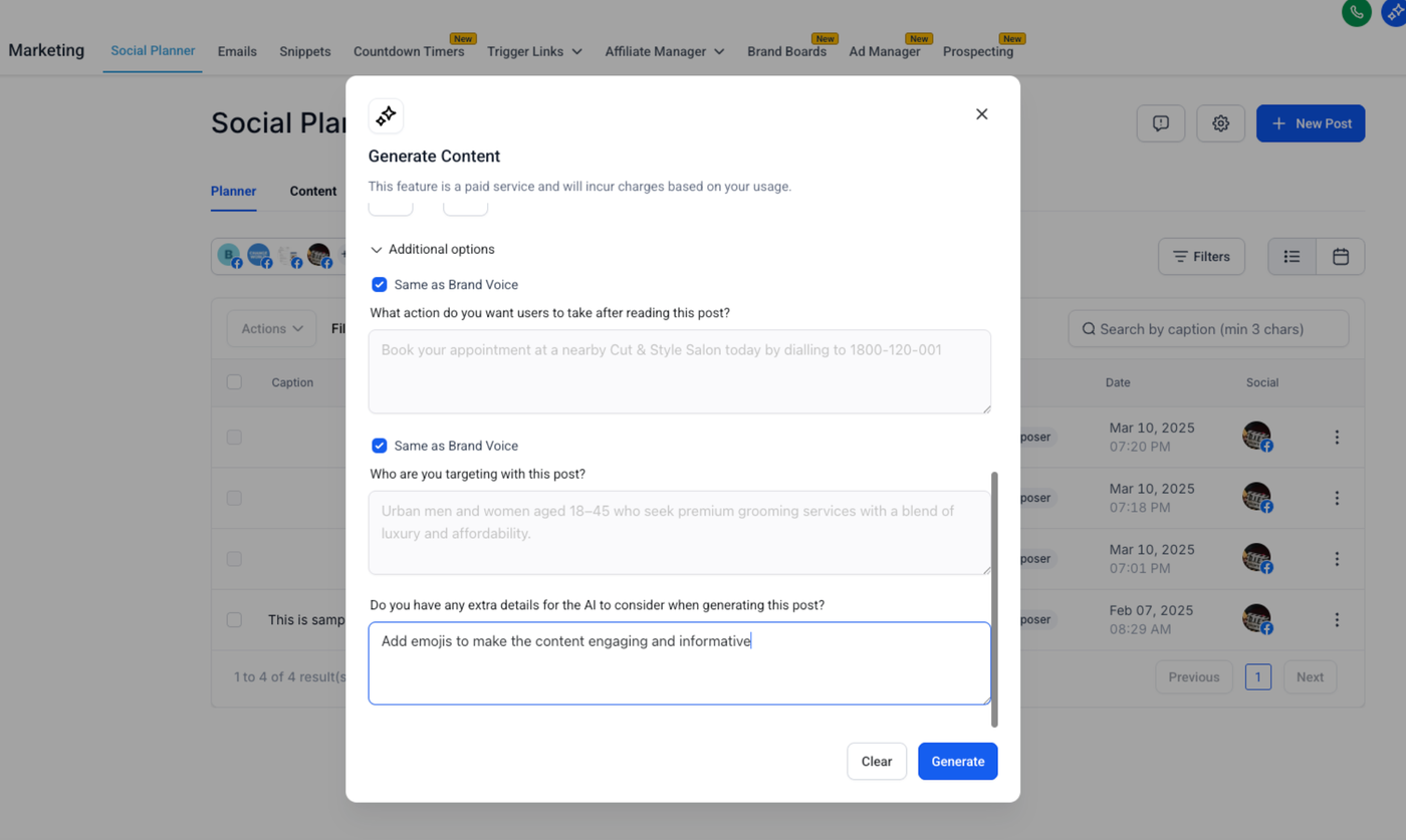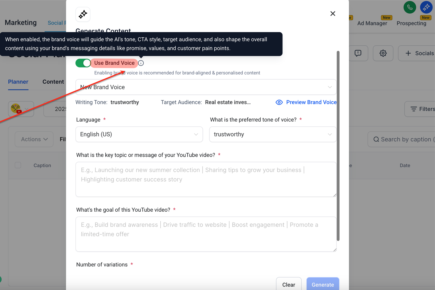 A: Ja, die Brand-Voice-Felder werden automatisch ausgefüllt, können aber für jeden einzelnen Beitrag bearbeitet oder überschrieben werden.