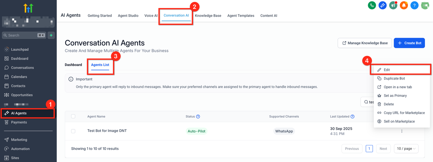 Gehe in deinem Sub-Account zu AI Agents → Conversation AI → Agent List, klicke dann auf die drei Punkte (⋮) neben dem Bot, den du konfigurieren möchtest, und wähle Edit, um die Bot-Einstellungen zu öffnen.