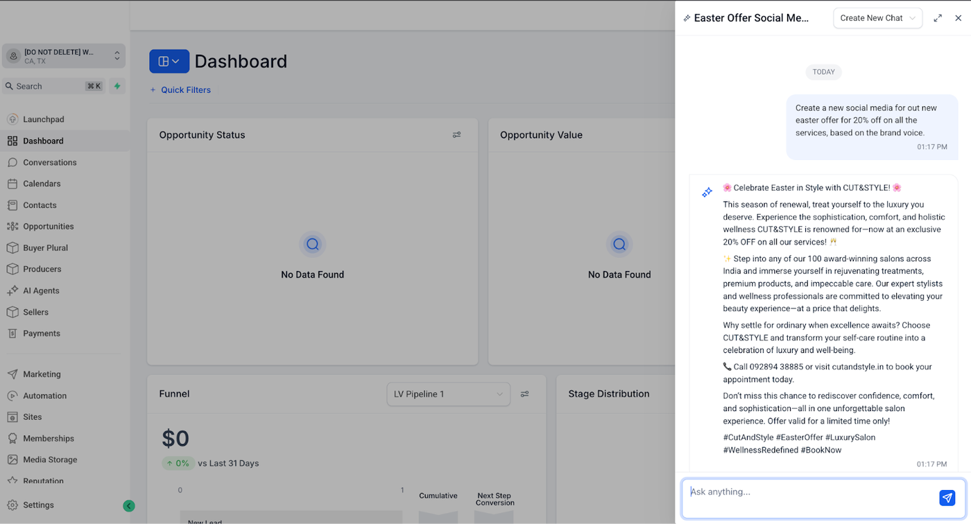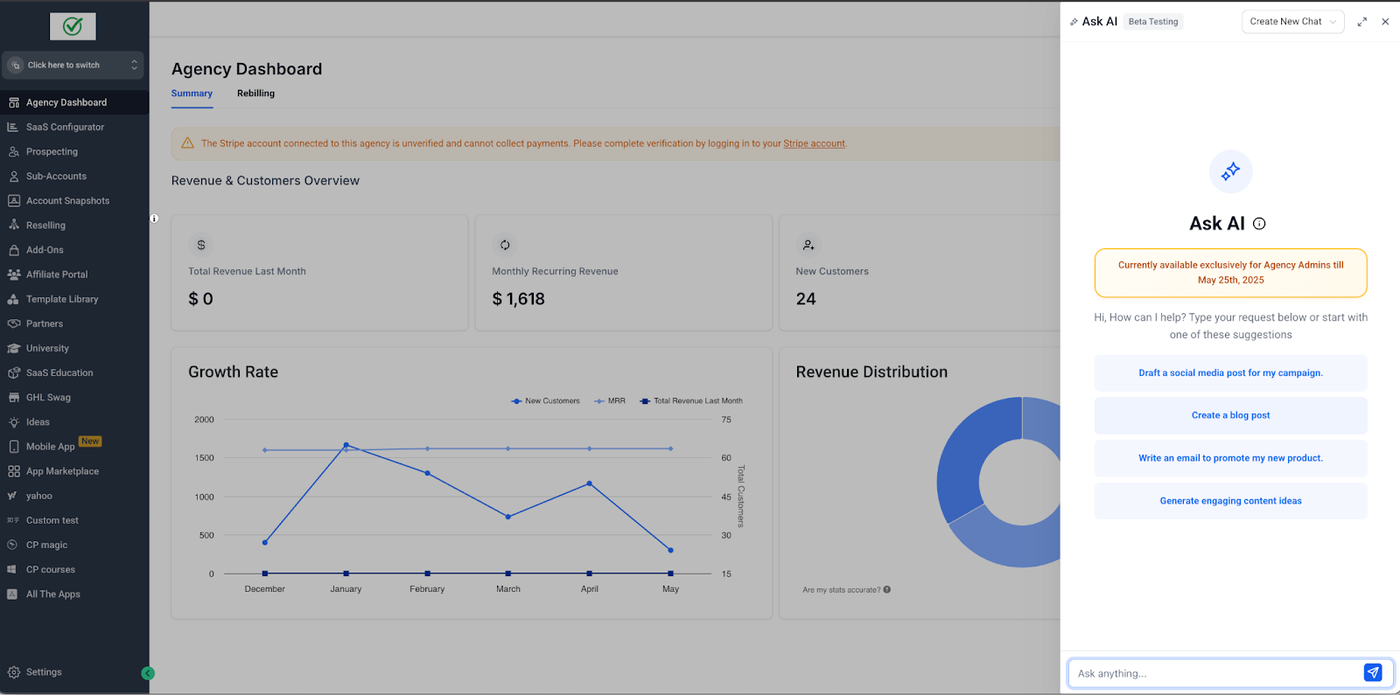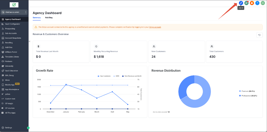 Derzeit ist Ask AI nur für Agency Admins und Sub-Accounts mit dem 97-$ Unlimited AI Employee Plan verfügbar. Du findest und nutzt es über die obere Navigationsleiste – klicke auf das Symbol und gib deine Prompts ein.