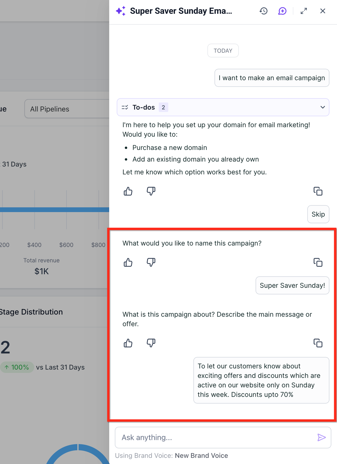 Starte in wenigen Minuten professionelle, datengetriebene Broadcasts mit dem Email Campaign Agent (Beta) von HighLevel. Dieser KI-gestützte Builder vereinfacht Texterstellung, Betreffzeilen-Tests, Zielgruppen-Targeting und die Einrichtung der Versanddomain, damit du smartere Kampagnen schneller versenden kannst. Nutze ihn, um mit Ask AI markenkonforme Inhalte zu erstellen, A/B-Tests durchzuführen, Segmente oder Smart Lists anzusprechen und eine dedizierte Versanddomain für bessere Zustellbarkeit zu verifizieren.