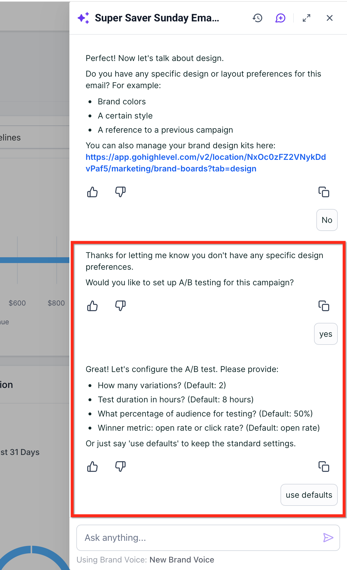 Markenkonformer Text: Erstelle vollständige E-Mails mit Ask AI und deiner Brand Voice – konsistent und ohne leere Seite.