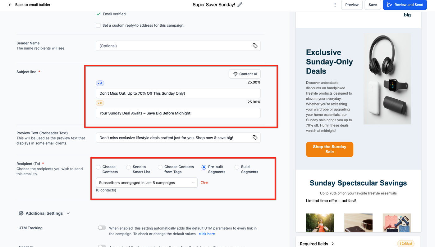Schnelleres Experimentieren: Generiere mehrere Betreffzeilen und führe integrierte A/B-Tests durch, um Öffnungen und Klicks zu steigern.