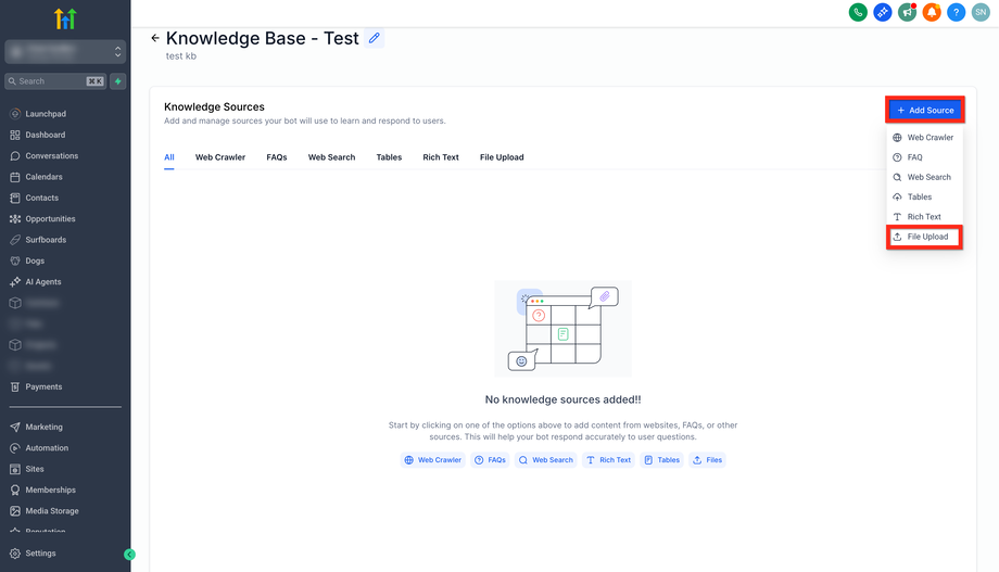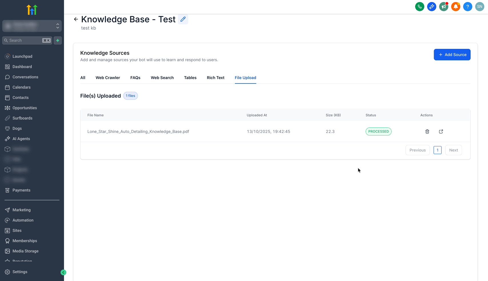A: Nein. Jeder Upload wird als neue Quelle hinzugefügt. Dateibasierte Quellen und Rich-Text-Einträge können parallel zu URLs und FAQs bestehen bleiben.