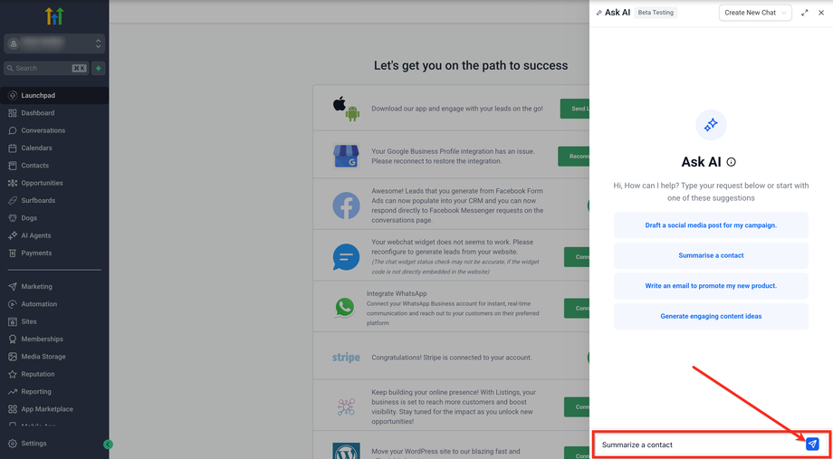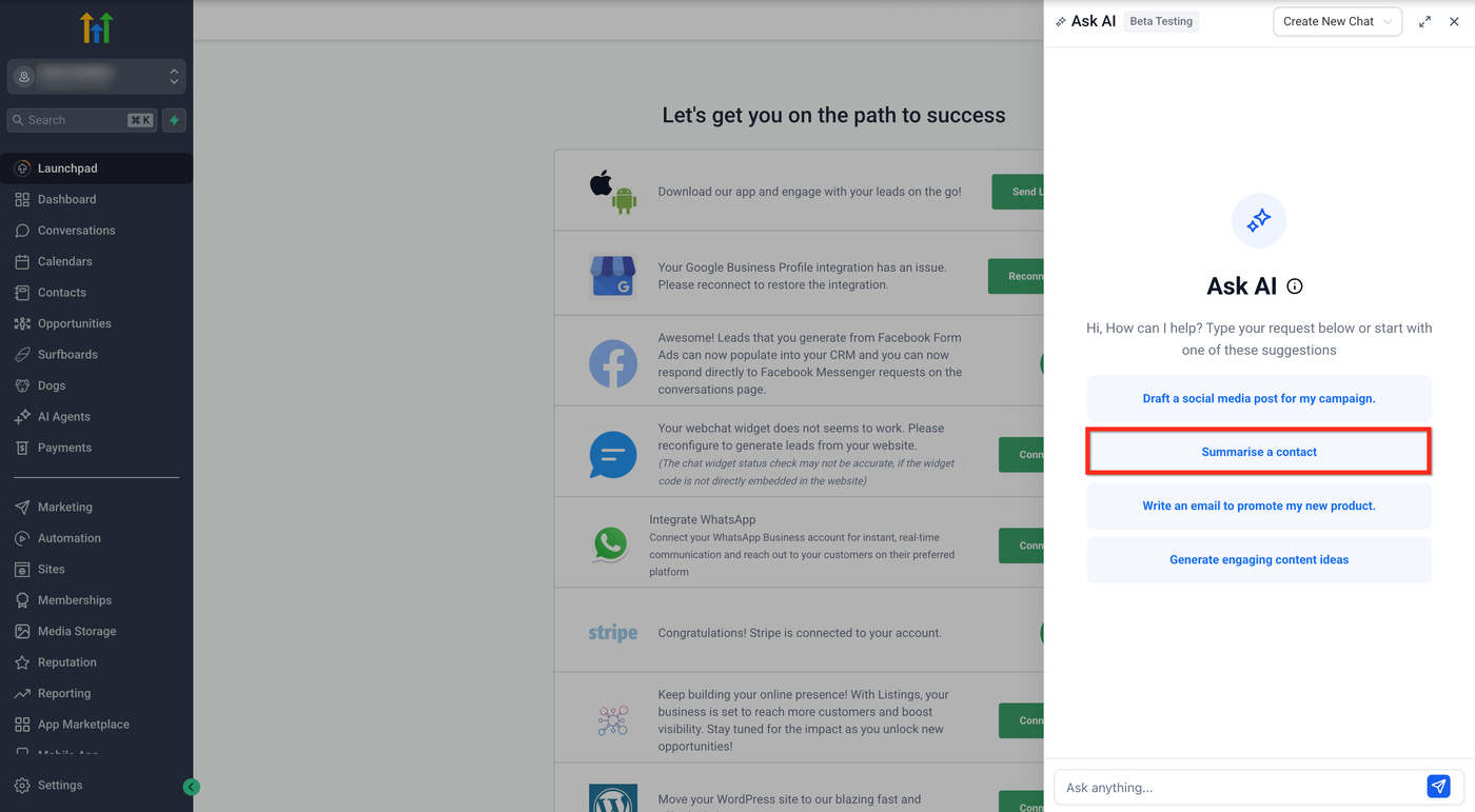 Der Contact Summary Agent ist eine neue KI-gestützte Funktion innerhalb des Ask-AI-Tools von HighLevel Copilot, die entwickelt wurde, um Kontaktdatensätze sofort zusammenzufassen und detaillierte Fragen zu jedem Kontakt zu beantworten. Diese Funktion vereinfacht den Zugriff auf und die Interpretation von Kontaktdaten, spart Zeit und liefert umsetzbare Erkenntnisse über eine einfache, dialogbasierte Eingabe.