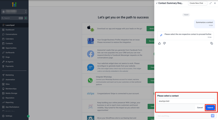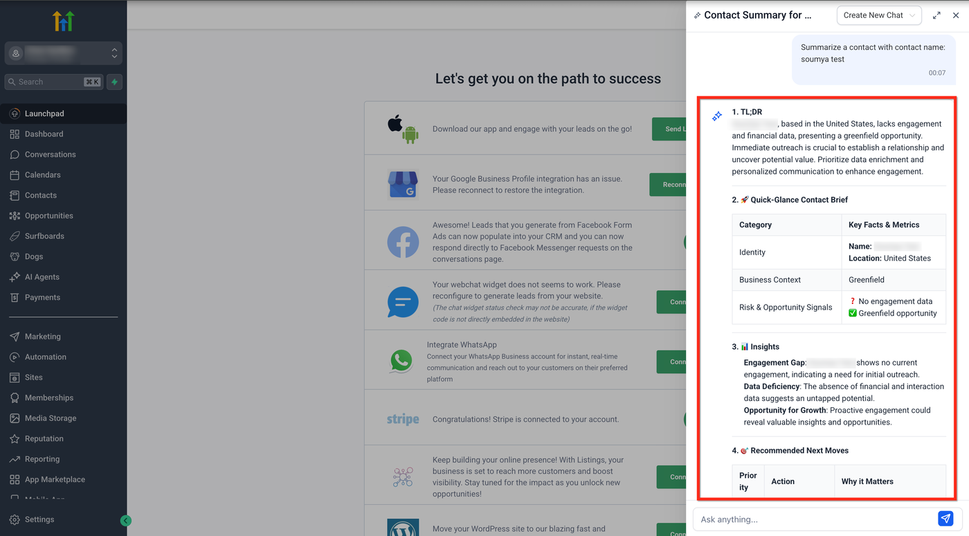 Der Contact Summary Agent ist eine intelligente Funktion innerhalb von HighLevels Copilot, die verstreute Kontaktinformationen – wie Kommunikation, Zahlungen, Termine und Aufgaben – in einer einzigen, leicht verständlichen Zusammenfassung bündelt. Durch den Einsatz von Natural Language Processing ermöglicht er es Nutzern, Fragen zu stellen oder Zusammenfassungen zu einem beliebigen Kontakt anzufordern und sofort menschenähnliche Antworten zu erhalten, ohne zwischen mehreren Tools oder Bildschirmen wechseln zu müssen.