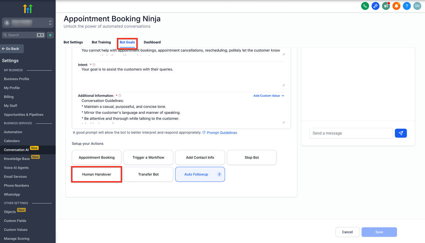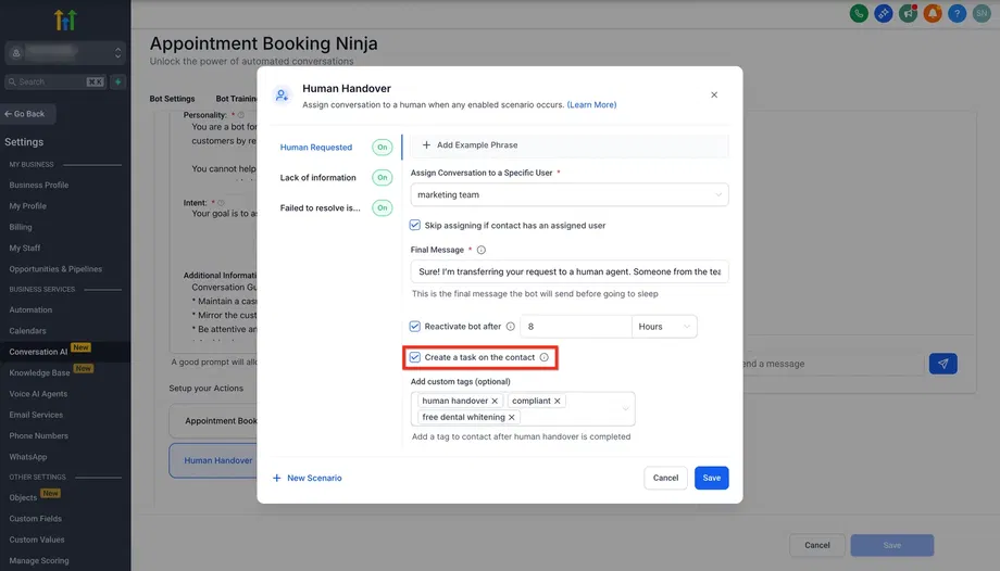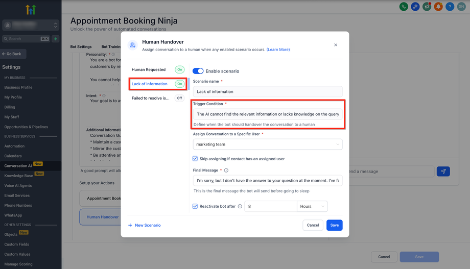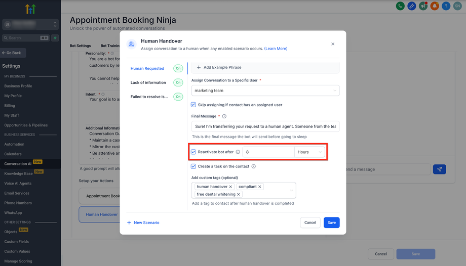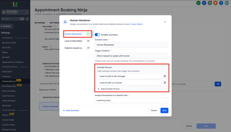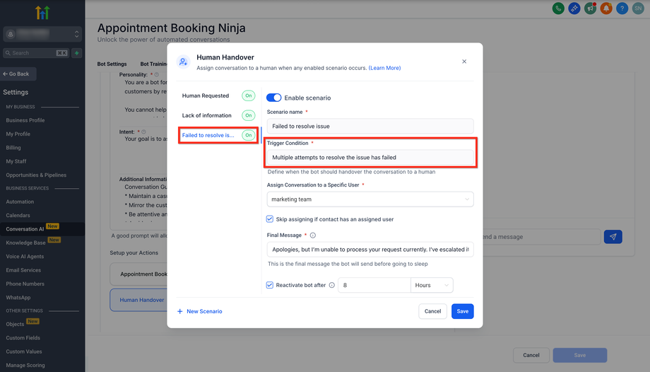 Human Handover ist eine erweiterte Funktion innerhalb von HighLevels Conversation AI, die Unterhaltungen automatisch vom KI-Bot an ein menschliches Teammitglied übergibt, sobald bestimmte Bedingungen erfüllt sind.
