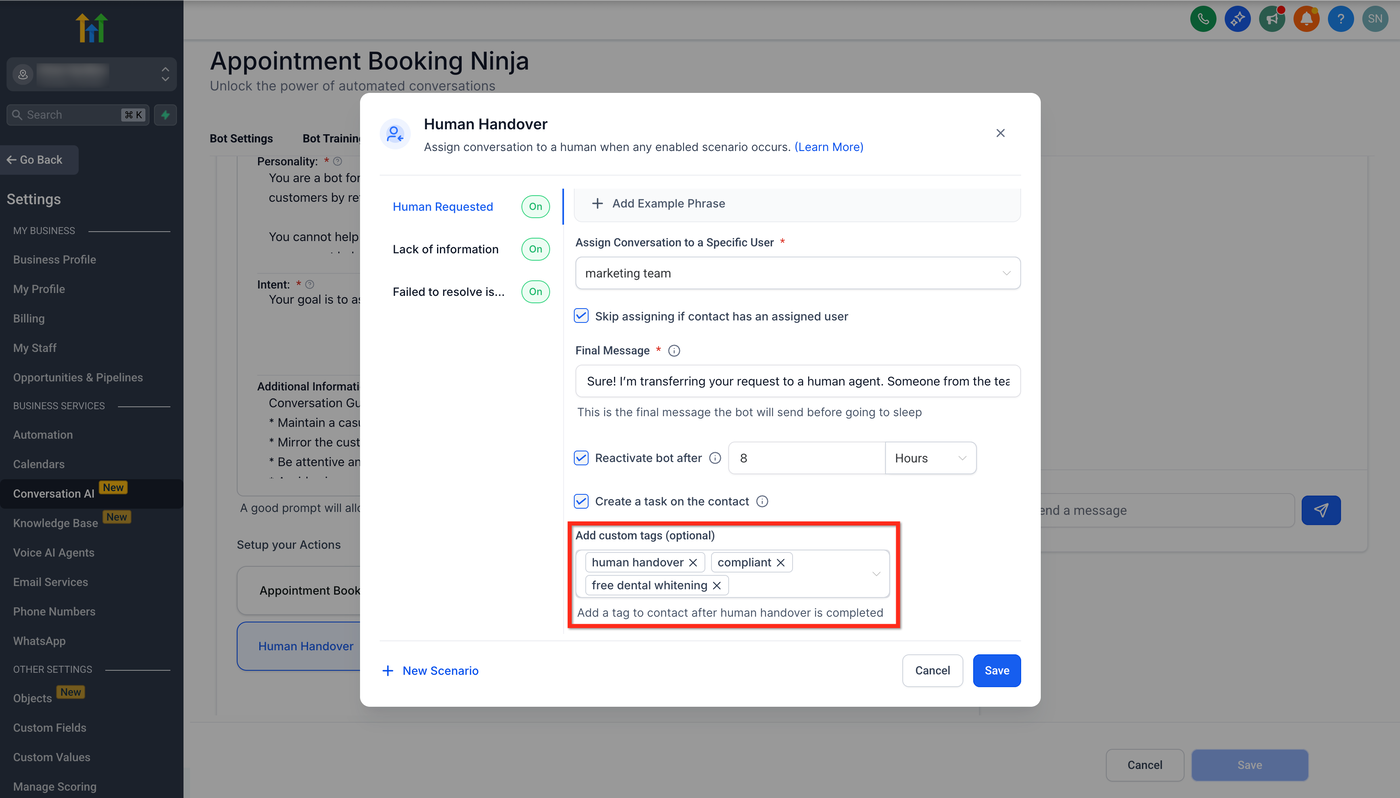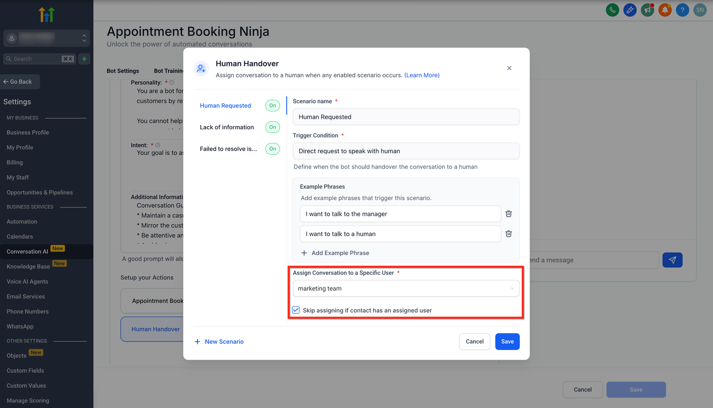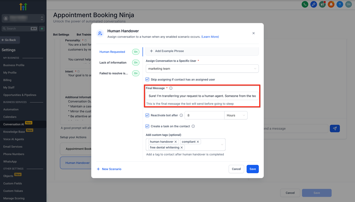 Human Handover ist eine erweiterte Funktion innerhalb von HighLevels Conversation AI, die Unterhaltungen automatisch vom KI-Bot an ein menschliches Teammitglied übergibt, sobald bestimmte Bedingungen erfüllt sind.