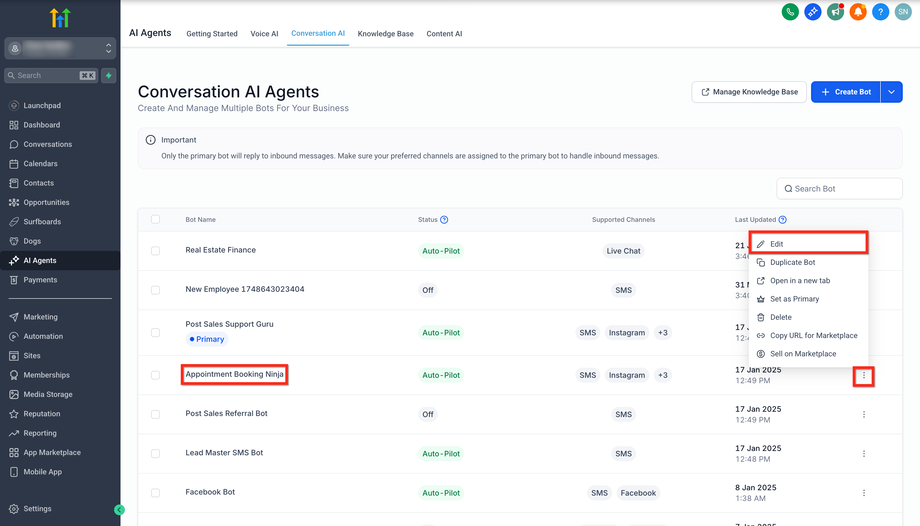 Klicke auf den Bot-Namen oder auf die drei Punkte neben „Last Updated“ und wähle Edit.