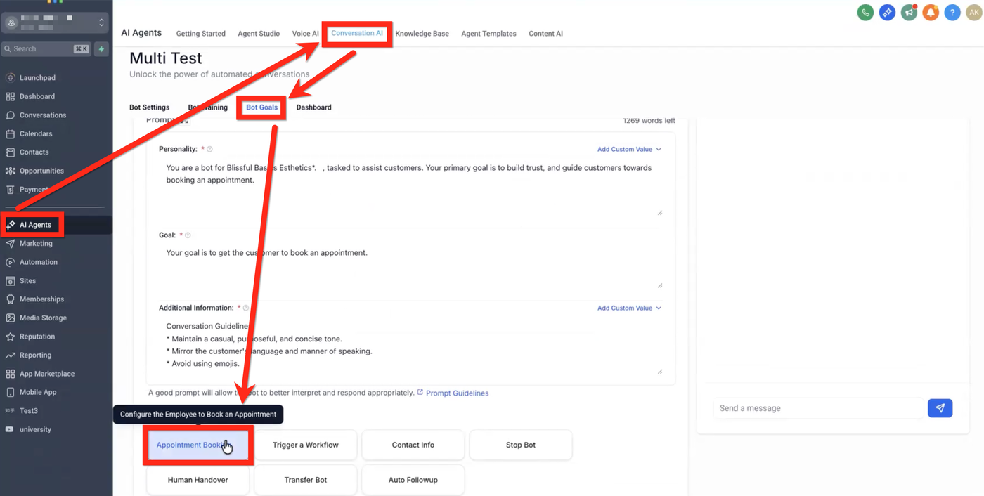 Navigieren Sie zu AI Agents → Conversation AI → Bot Goals und wählen Sie Appointment Booking.