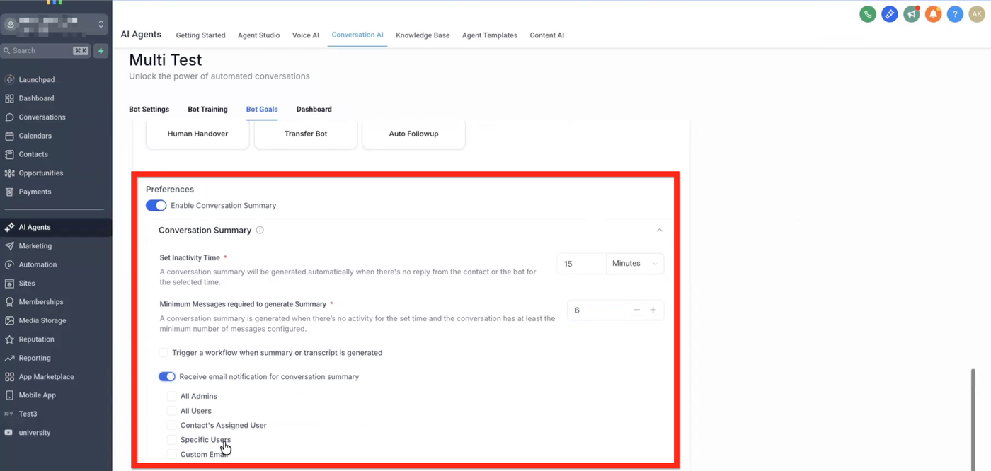 Die Bot-Goals-Einstellungen für Conversation Summary und Transcript werden ausführlich in diesem Artikel beschrieben: