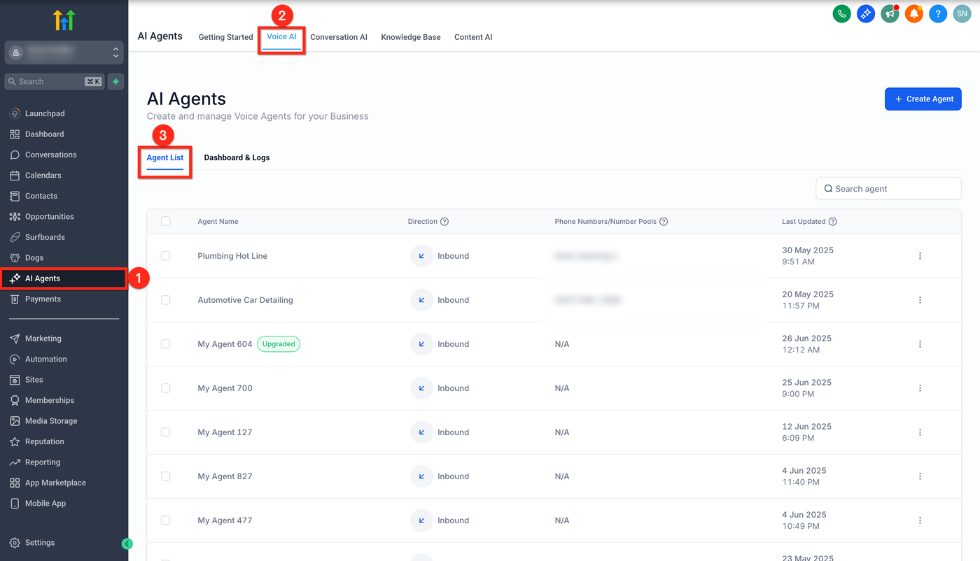 Klicke in deinem Sub-Account auf AI Agents.