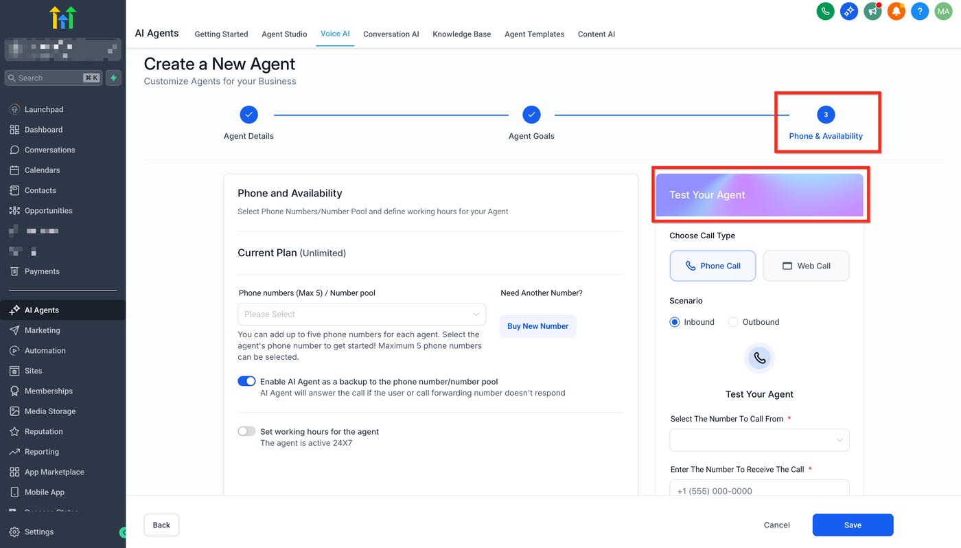Du kannst einen Voice AI Agent auch während der Erstellung testen. Nutze im Create Agent-Flow im Schritt Phone & Availability das Test Your Agent-Panel für Web Call- und Phone Call-Tests.
