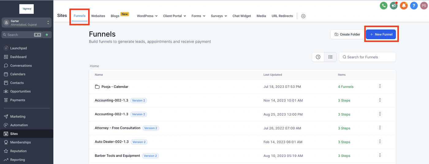 Gehe zu Sites > Funnels oder Website.