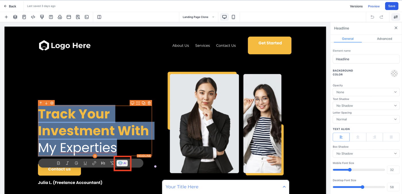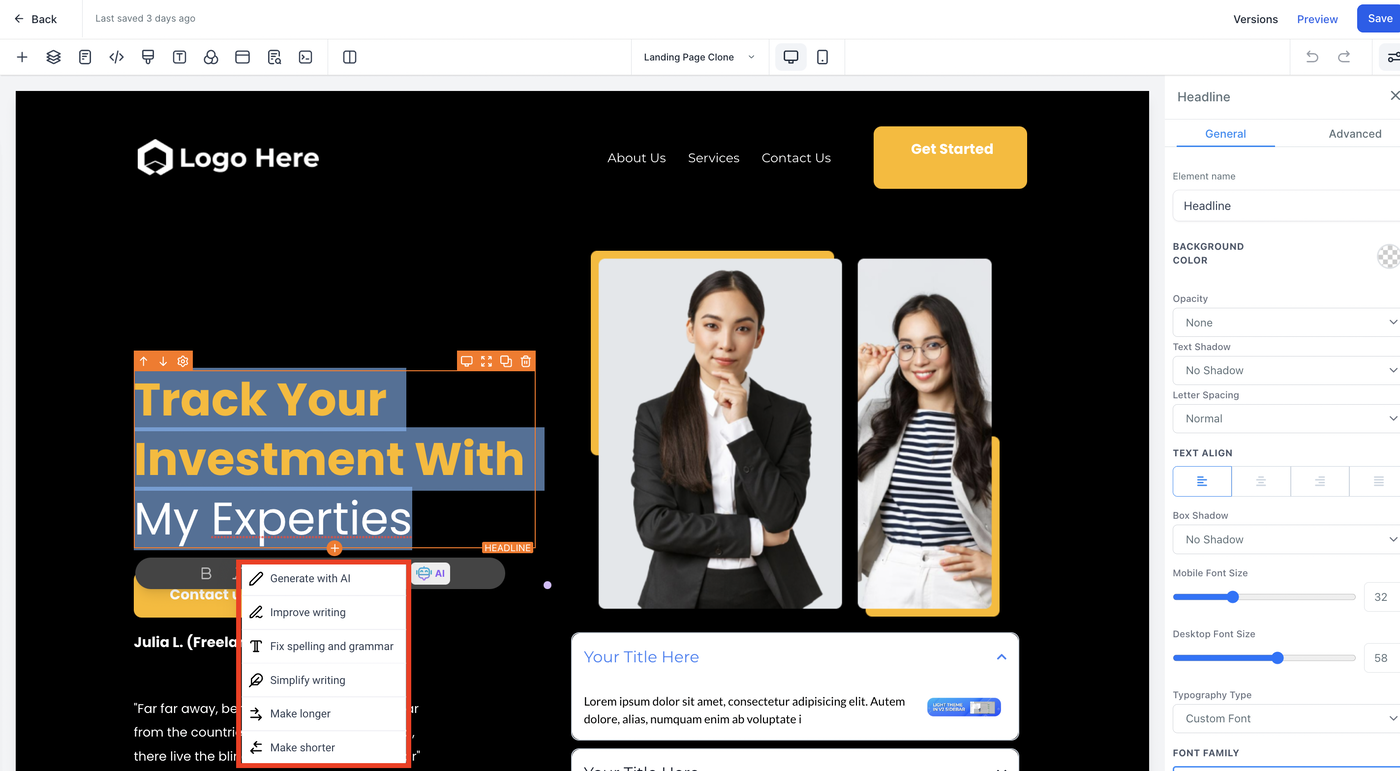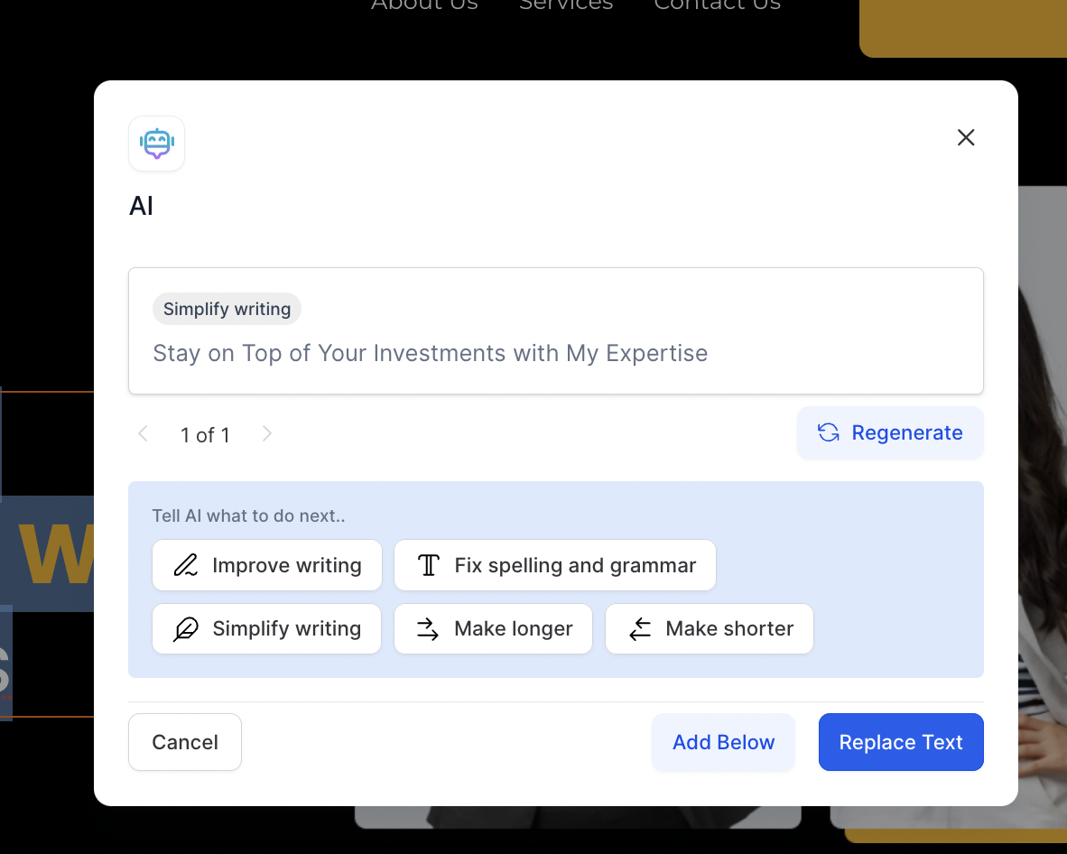 Wenn du den Text für Absatz, Überschrift, Unterüberschrift oder Bullet Points mit KI generieren möchtest, klicke auf AI und dann auf edit with AI.