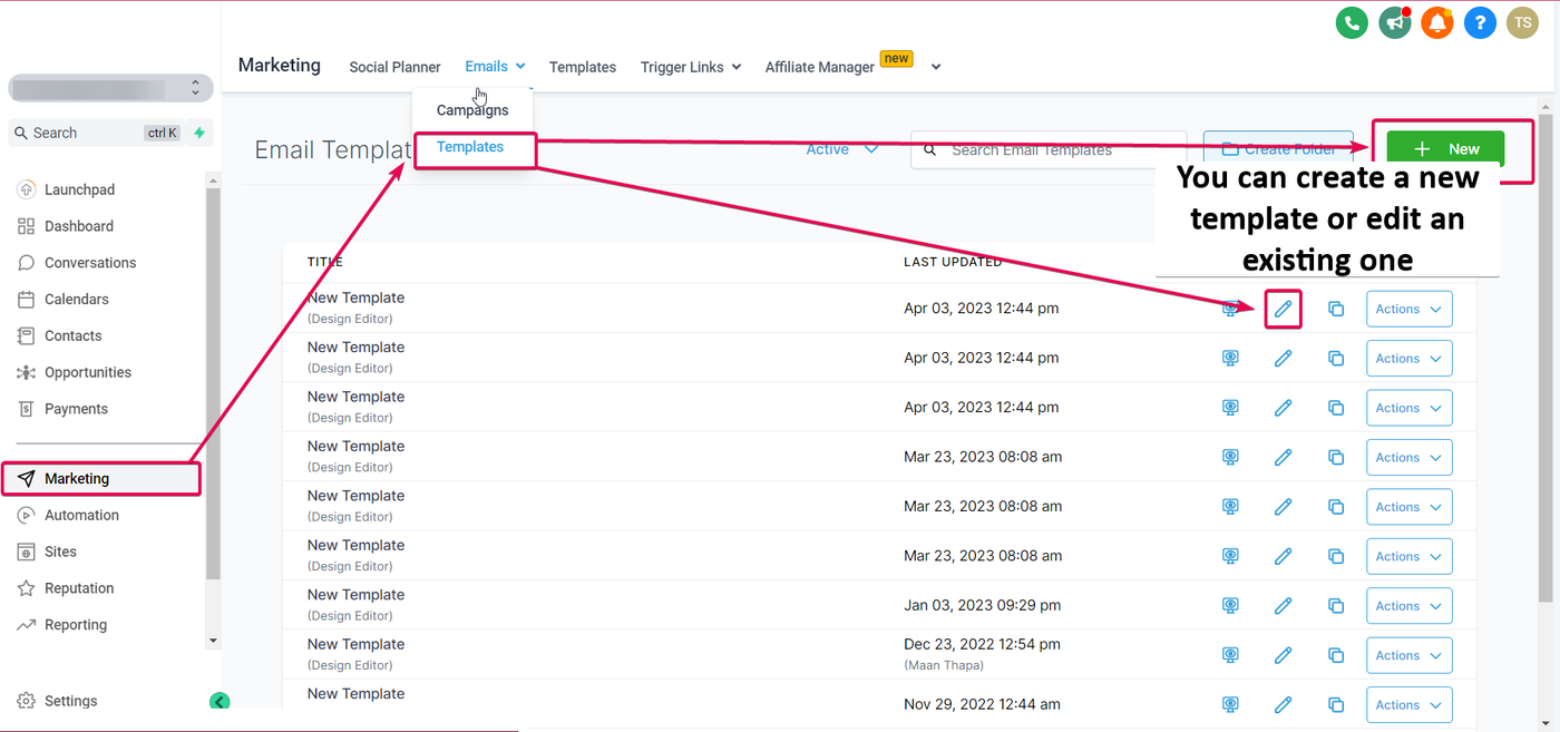Für E-Mail-Vorlagen gehen Sie zu Marketing > Emails > Templates > New oder bearbeiten Sie eine bestehende Vorlage.