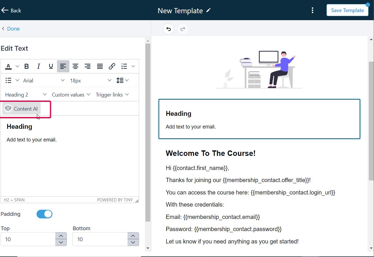 Content AI ist sowohl in E-Mail-Vorlagen als auch in E-Mail-Kampagnen verfügbar.