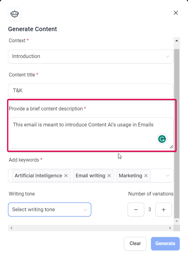 Sie müssen dann eine Content Description angeben, den Writing Tone auswählen und die Number of Variations festlegen, die generiert werden sollen, und anschließend auf Generate klicken.