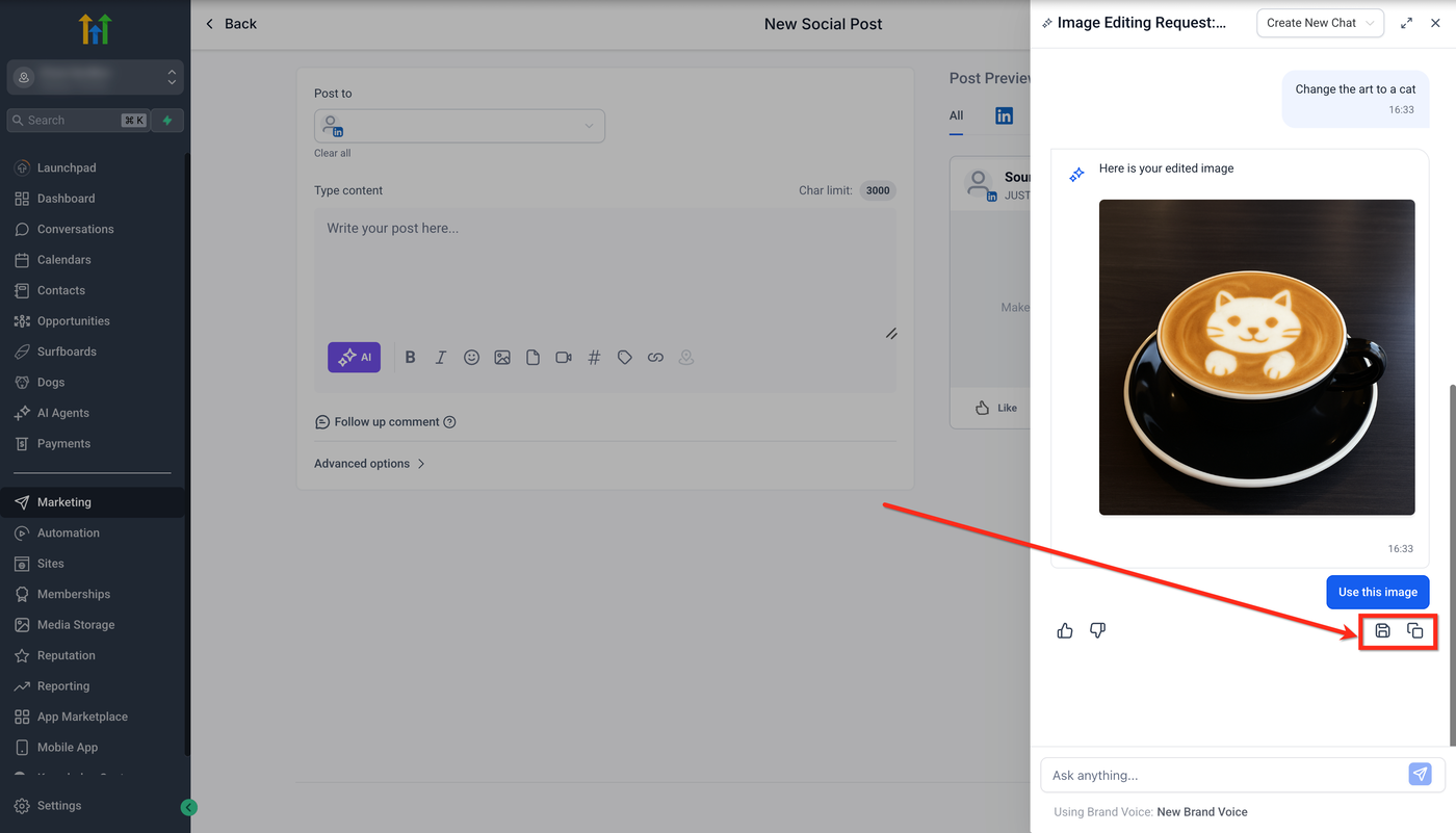 Klicke auf das Speichern-Icon, um das Bild dauerhaft in deiner HighLevel-Medienbibliothek zu speichern.