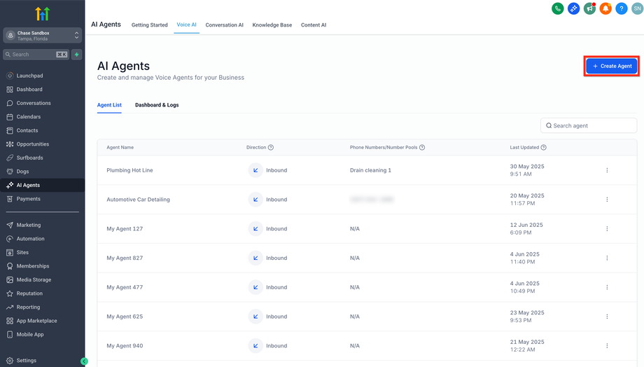 Klicke auf + Create Agent, um einen neuen Agenten zu erstellen, oder