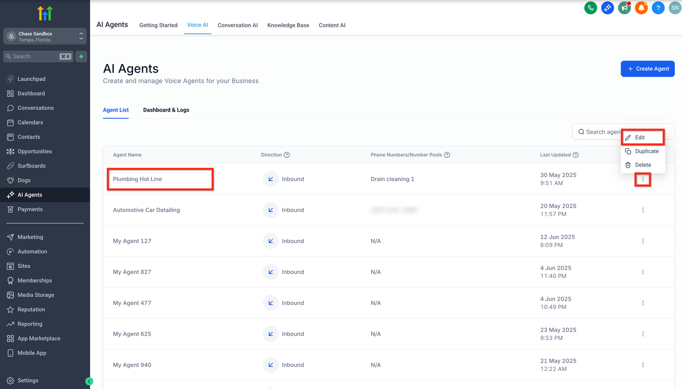 Klicke auf das Drei-Punkte-Menü neben dem Agenten und wähle Edit.