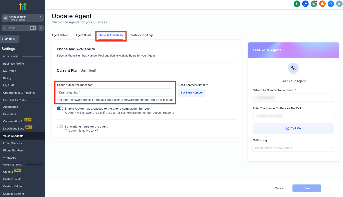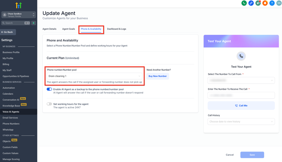 Klicke im Agenten-Editor auf den Tab Phone & Availability.