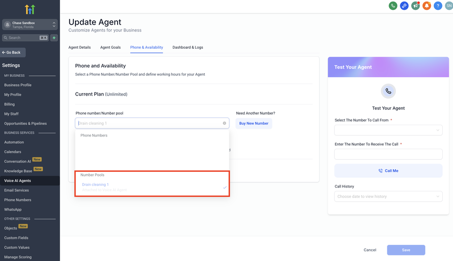 Wähle den Nummernpool, den du diesem Voice-AI-Agenten zuweisen möchtest.