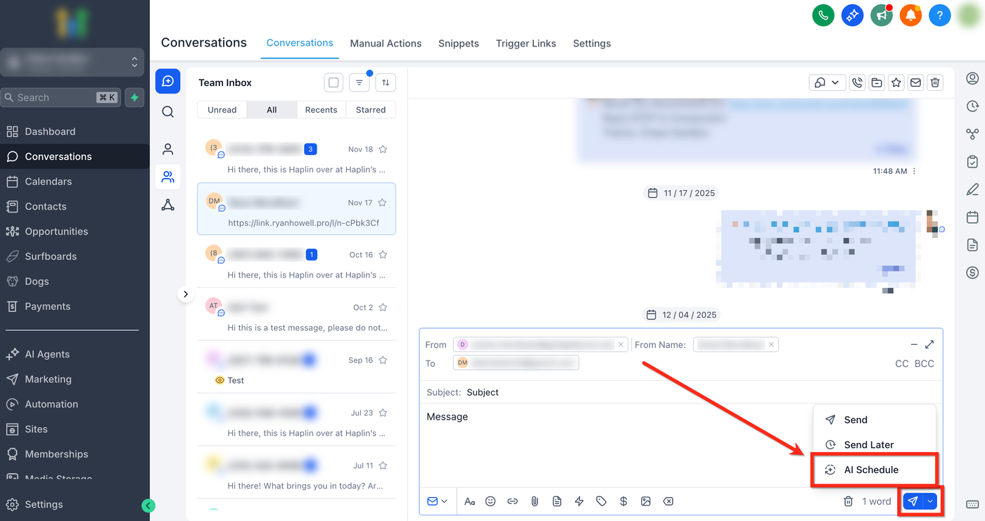 AI Schedule auswählen: Klicke im Send-Menü auf AI Schedule.