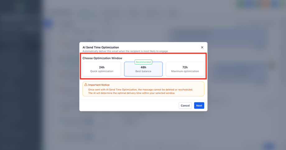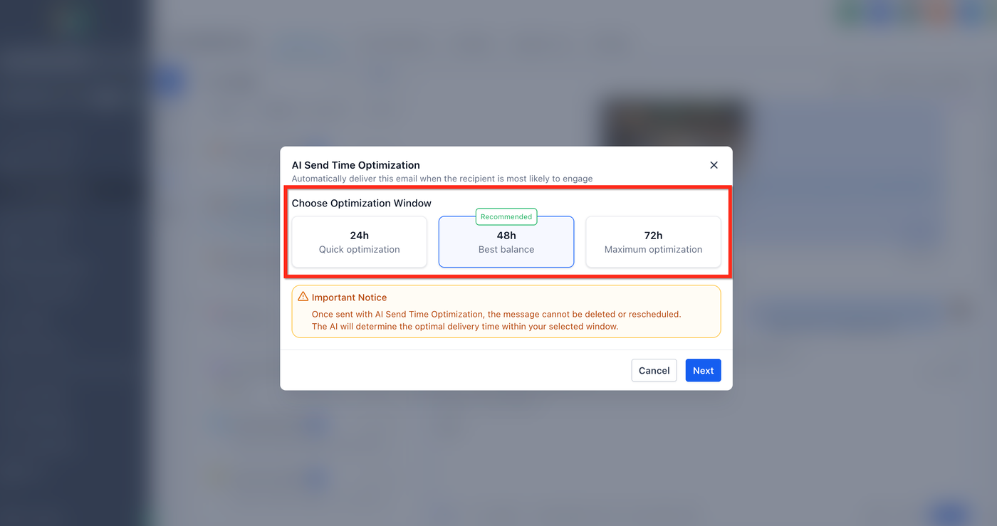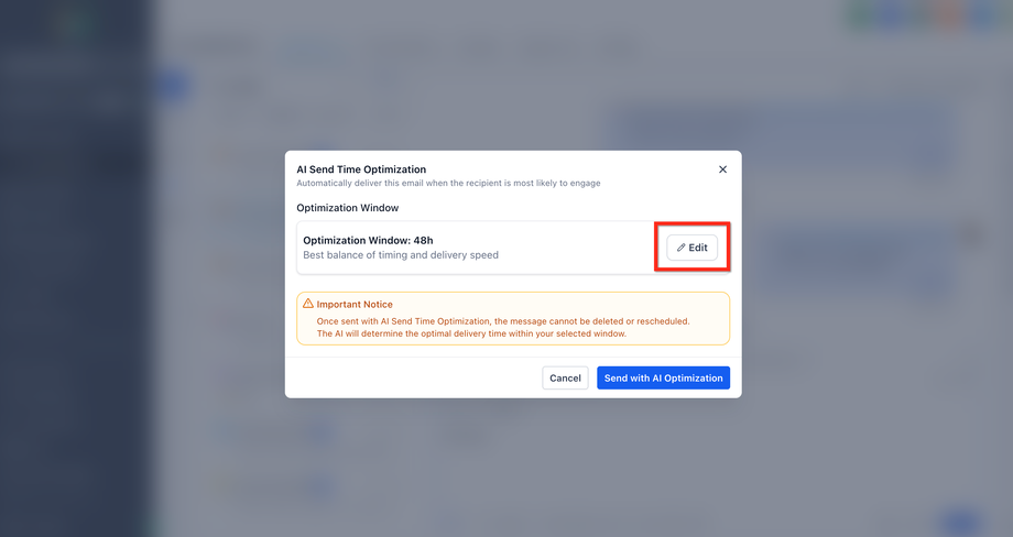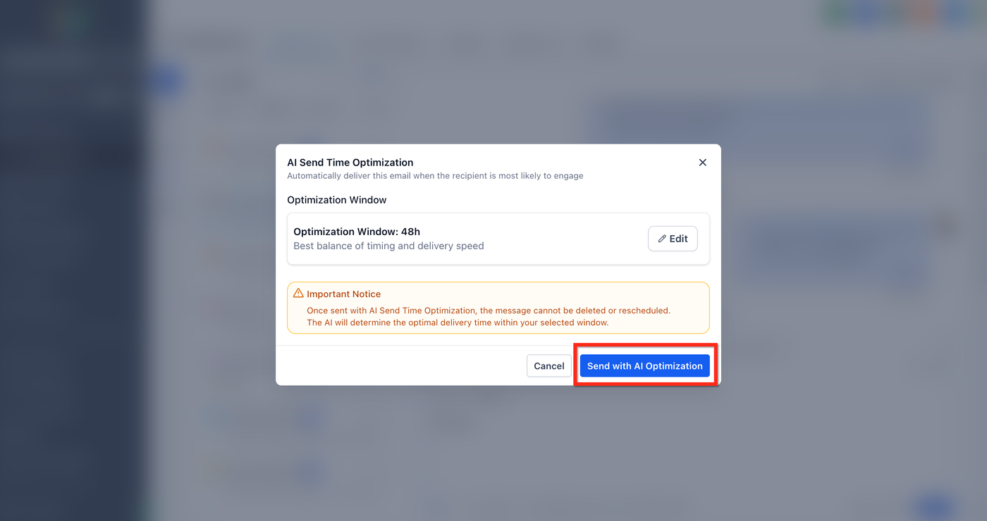 Wichtig: Nach Bestätigung von Send with AI Optimization kann die Nachricht nicht gelöscht oder neu geplant werden.