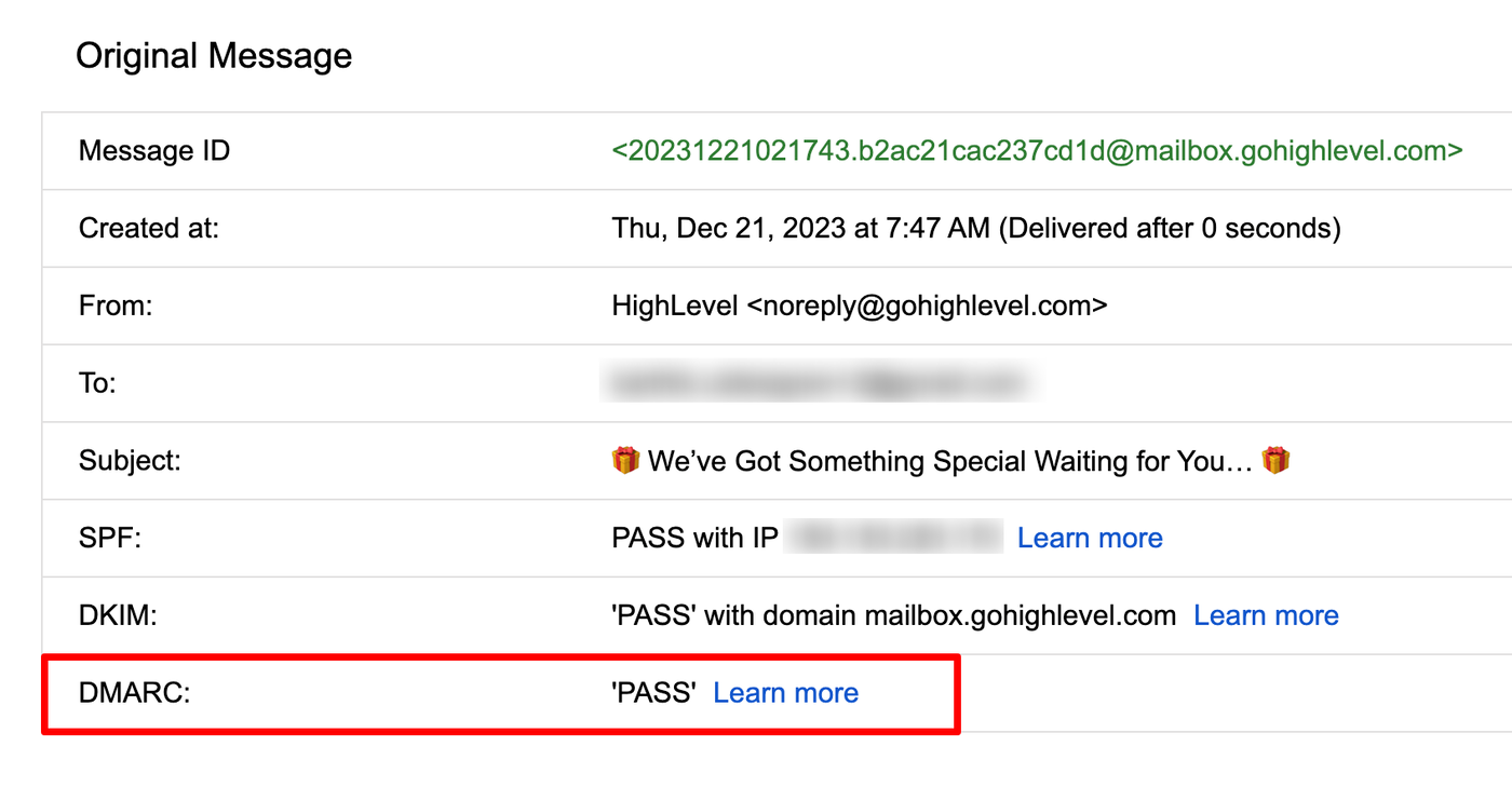 Um den DMARC-Standards zu entsprechen, muss die Domain deiner „From“-Adresse mit der Root-Domain deiner gebrandeten Versand-Domain übereinstimmen. Wenn deine gebrandete Versand-Domain beispielsweise „lc.msgsndr.com“ ist, lautet die entsprechende Root-Domain „msgsndr.com“. Die Verwendung von „hello@msgsndr.com“ als „From“-Adresse stellt somit die Ausrichtung auf die Root-Domain sicher.