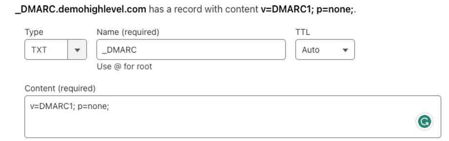 So würde der Record aussehen, wenn er in Cloudflare für eine Domain namens demohighlevel.com eingerichtet wird: