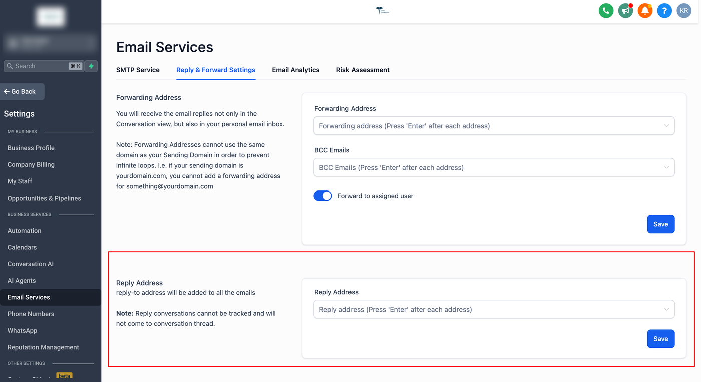 Jetzt gibt es die Möglichkeit, eine Reply-to-Adresse hinzuzufügen. Alle eingehenden E-Mails werden an diese E-Mail-Adresse gesendet, anstatt im Conversation-Tab zu landen.