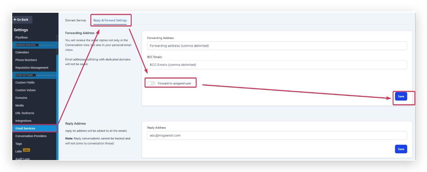 Stelle sicher, dass du nach dem Eingeben einer Reply-Adresse auf Save klickst.