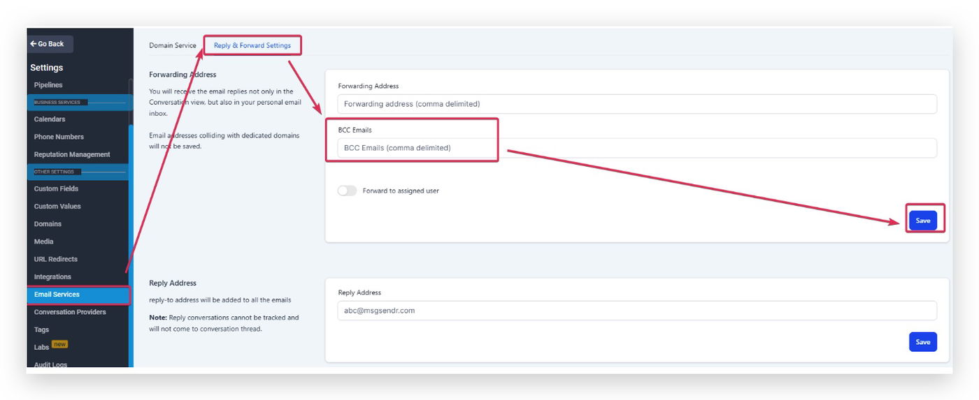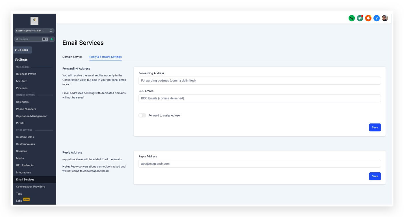 Du erhältst eine Blind Carbon Copy jeder 1-zu-1-E-Mail, Workflow-E-Mail und Billing-E-Mail, die von dieser Location gesendet wird. Dies ist konfigurierbar unter Settings > Email Services > Reply & Forward Settings > BCC Emails