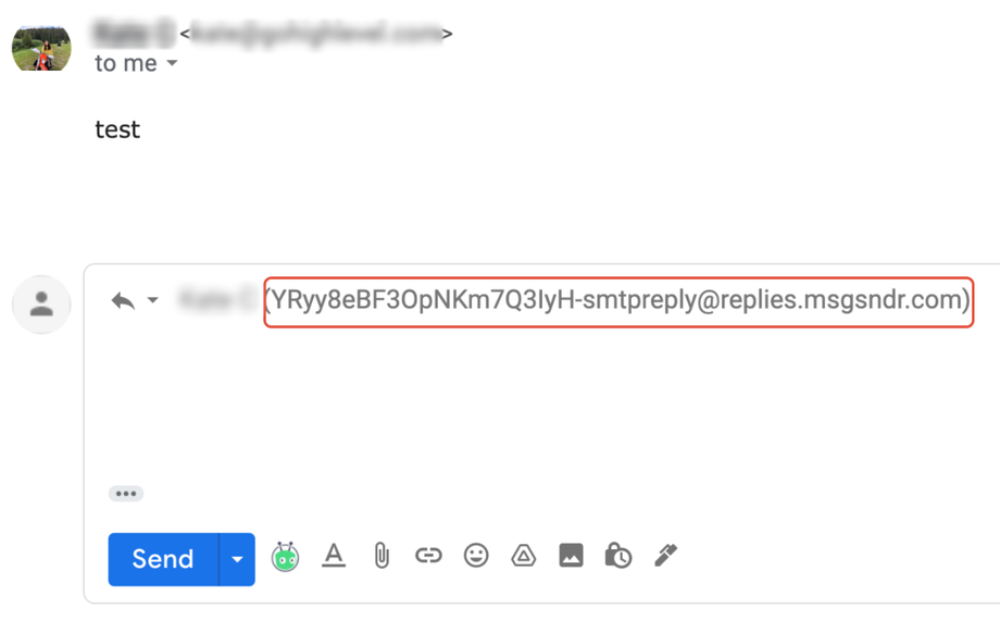 Wenn du die Absender-E-Mail maskierst, z. B. testing@gmail.com, wird die Reply-to-Adresse als testing@replies.subdomain.com angezeigt, wobei es sich um die Mailgun-Subdomain handelt, die wir für die Location in Agency Settings → Mailgun eingerichtet haben.