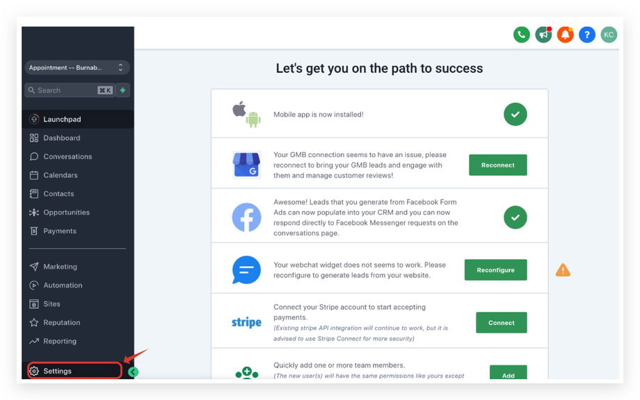 Sobald du dich in der Location befindest, klicke auf Settings → Email Services