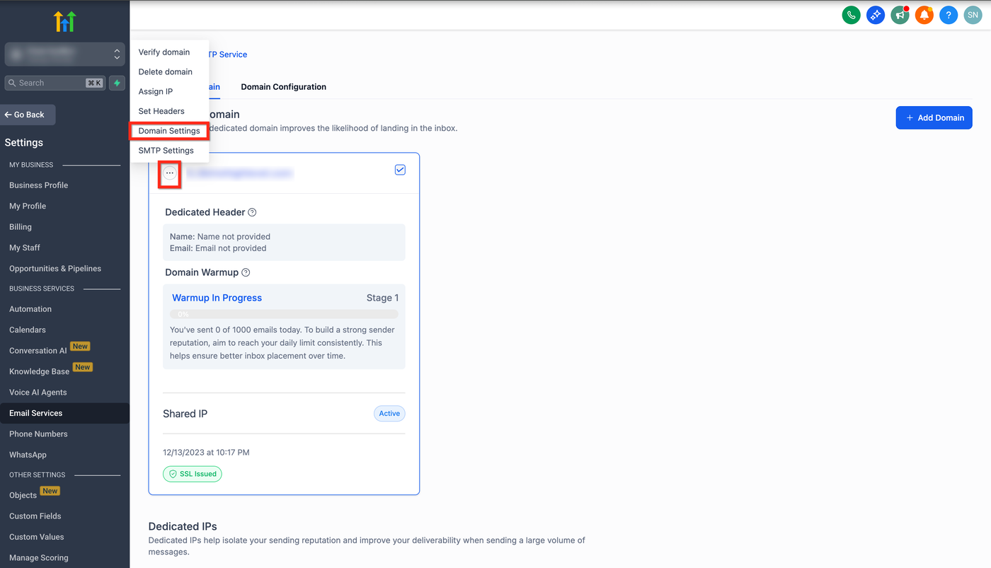 Klicken Sie auf die drei Punkte oben links bei Ihrer dedizierten LC Email Domain.