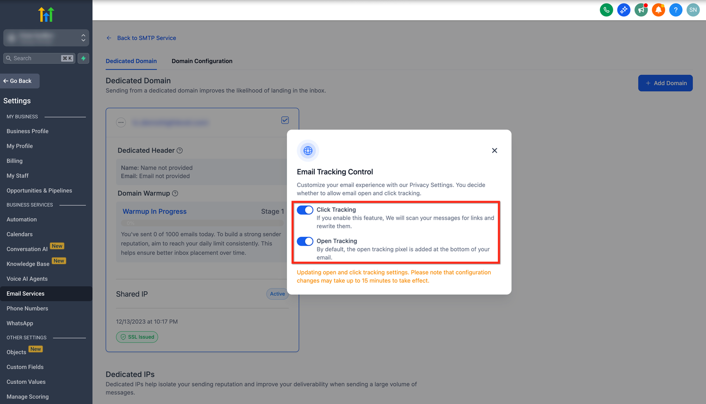 Im Pop-up können Sie die Optionen Click Tracking und Open Tracking aktivieren oder deaktivieren.