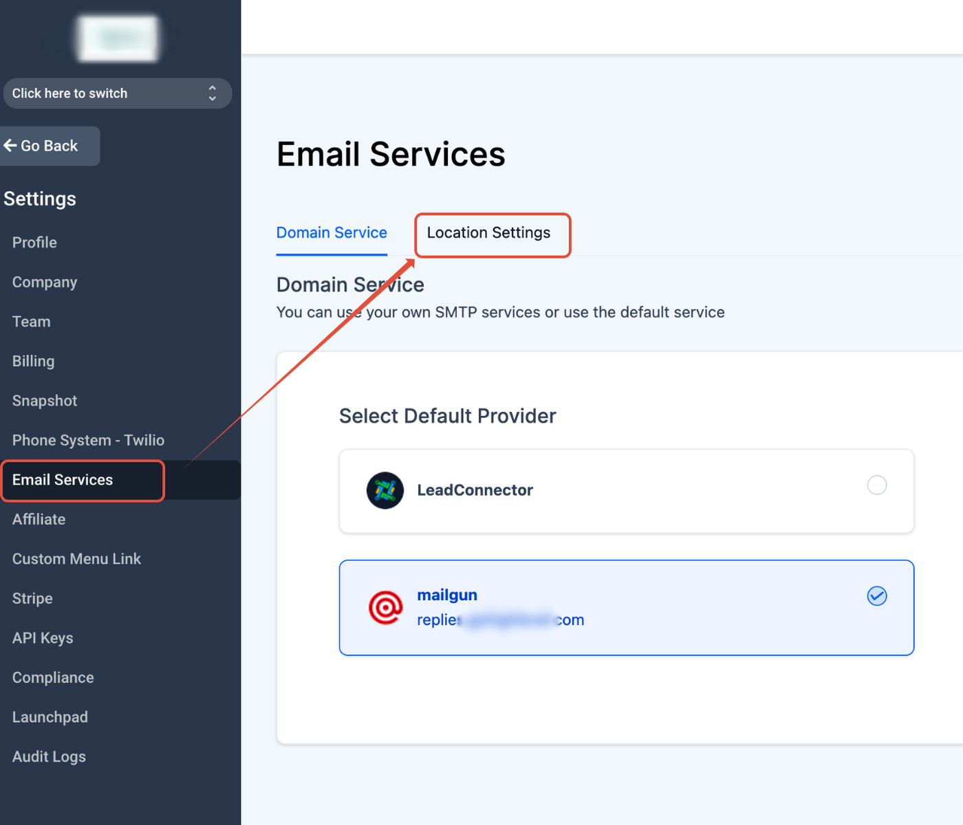 Klicken Sie auf E-Mail-Dienste und navigieren Sie zu Standorteinstellungen