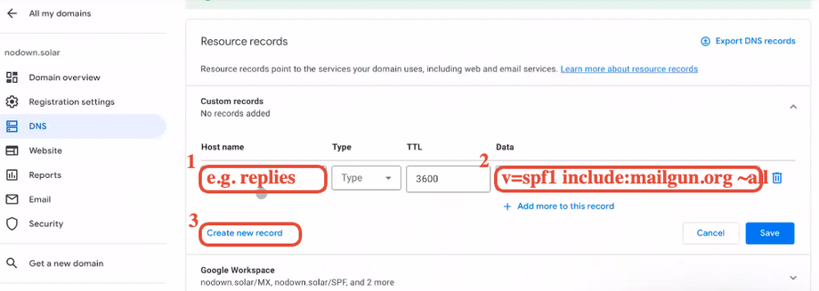 Hinweis: Wenn du ein Google Workspace-Konto für die Root-Domain hast (user@example.com), stelle sicher, dass du eine Subdomain für deine LC-Email-Dedizierte Domain nutzt. Sieh dazu den Artikel: Can I Use the Same Domain Name for Mailgun and for Google Apps (Or Another Email Server)?