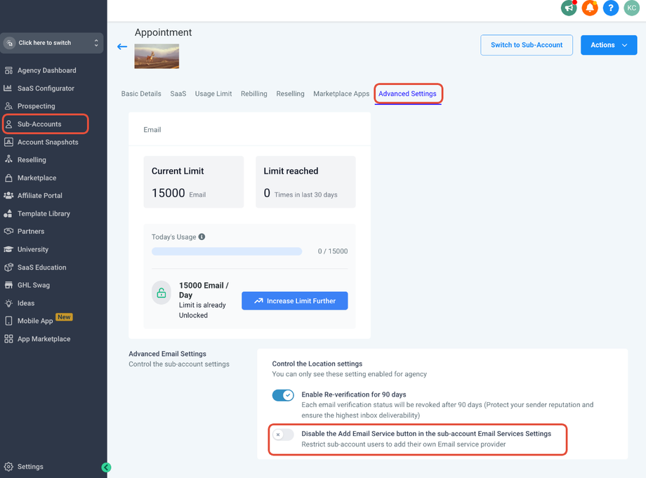 Klicken Sie auf Erweiterte Einstellungen > Stellen Sie sicher, dass die Option „Schaltfläche 'E-Mail-Dienst hinzufügen' in den E-Mail-Diensteinstellungen des Sub-Accounts deaktivieren“ ausgeschaltet ist.