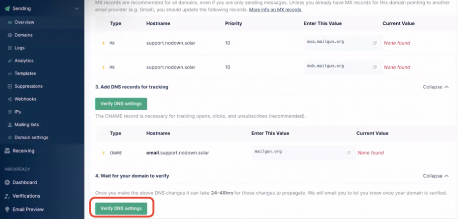 Gehe zurück zu Mailgun und klicke auf Verify DNS Settings