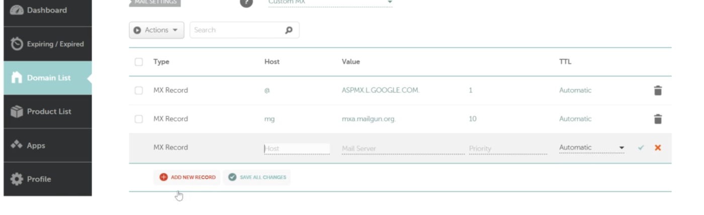 Sobald alle FÜNF MX-Records wieder hinzugefügt wurden, können wir die MX-Records für Mailgun hinzufügen