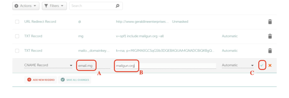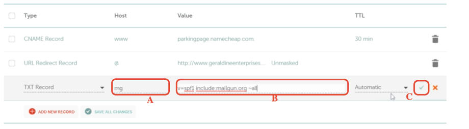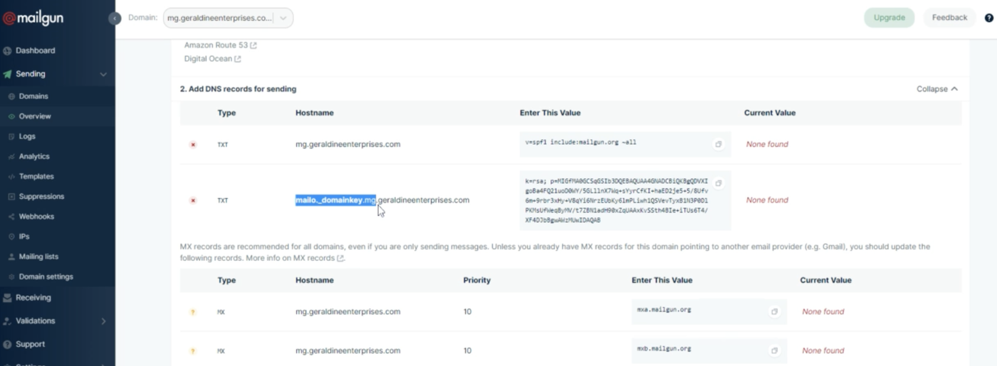 B. Gehe zurück zu Mailgun und kopiere den ersten TXT-Record hier: