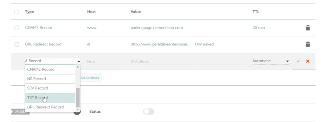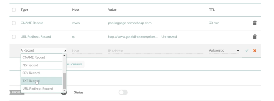 Wähle TXT Record aus dem Dropdown