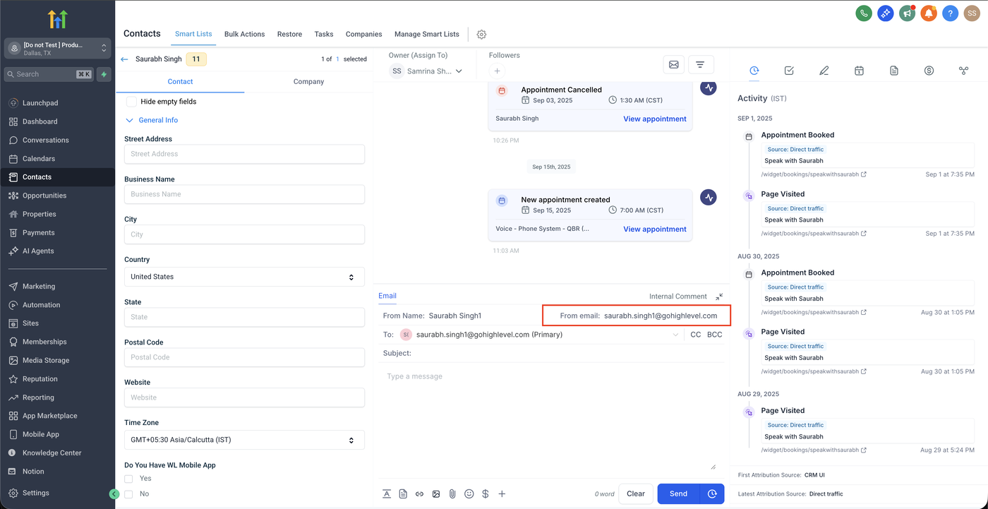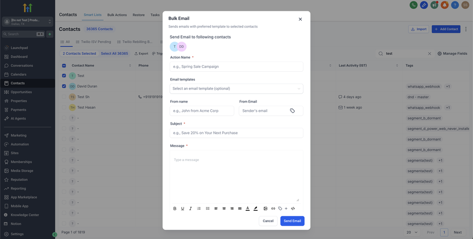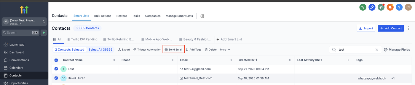 Klicke auf Contacts → Smart Lists → Wähle Kontakte aus → Klicke auf Send Email