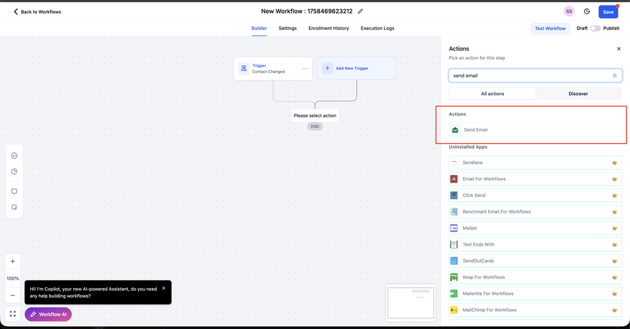 Klicke auf den + Button → Wähle die Option „Send Email“